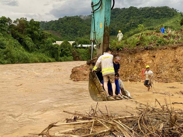 Lực lượng chức năng dùng xe múc giải cứu các công nhân mắc kẹt bên kia sông