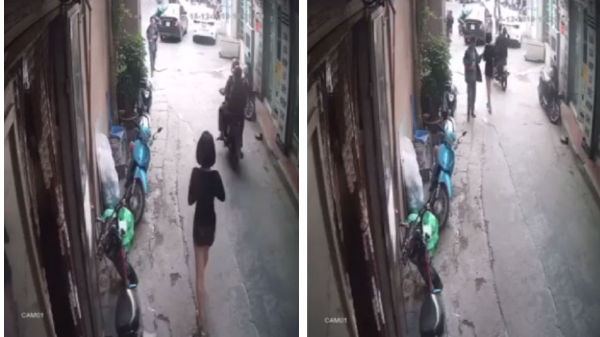 Cô gái trẻ vừa bước chân ra khỏi nhà 1 đoạn thì bị người đàn ông đi bộ ngược chiều thò tay sờ vào vòng 1 của mình. Ảnh cắt từ clip