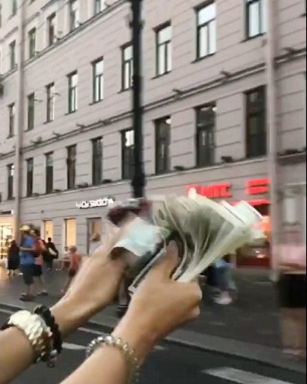 Clip quay cảnh 4 thiếu niên, 2 nam và 2 nữ lái xe dọc con phố ở St. Petersburg, thả xấp tiền trong lúc nghe nhạc rap để quay video.