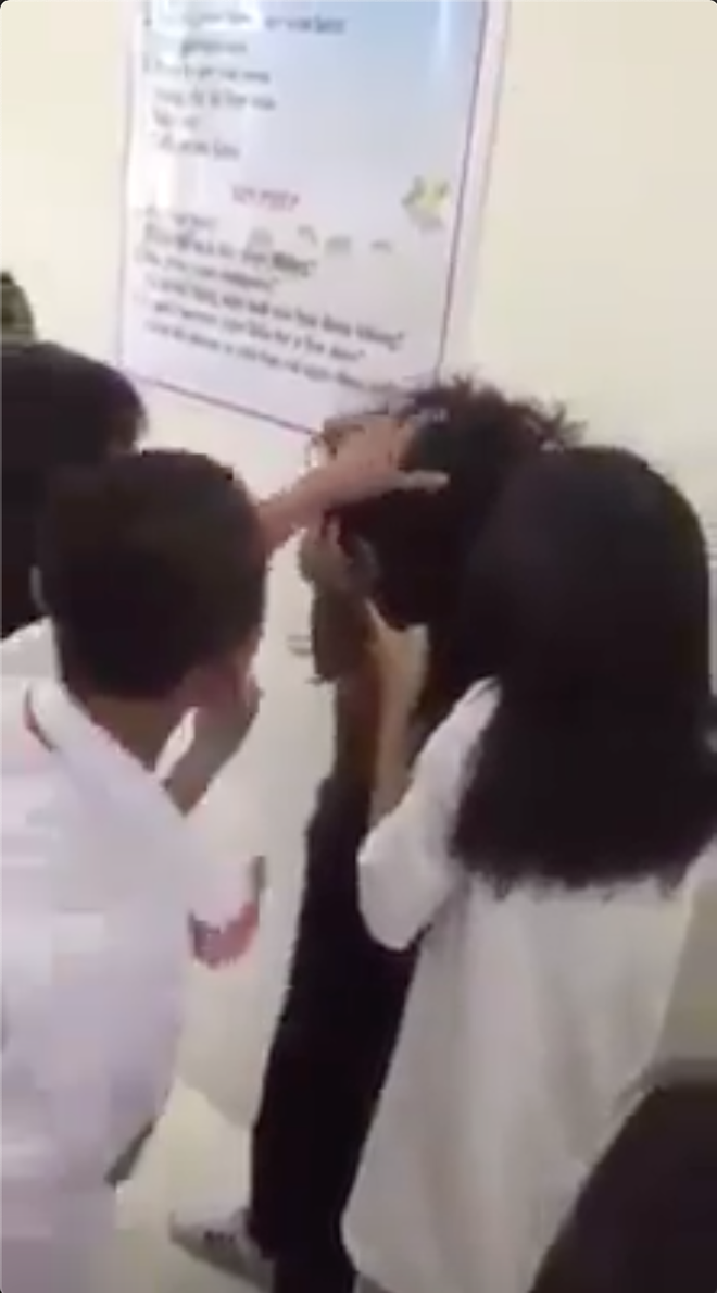 Nữ sinh bị đánh thì không thể chống cự, cúi gập người để né tránh những ngón đòn, tóc tai và quần áo bị giằng kéo xộc xệch, tả tơi.