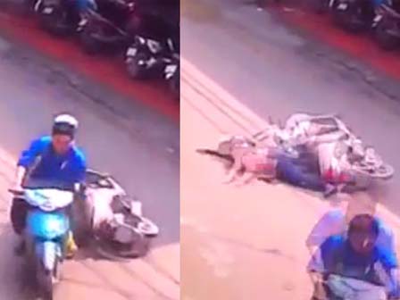 Sau cú va chạm nhẹ, cô gái tre bị văng khỏi xe và nằm sõng soài dưới đường