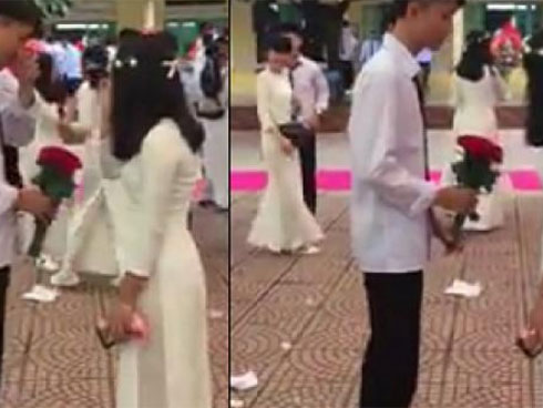 Bất ngờ bị chàng trai mình thích kéo tay lại để thể hiện tình cảm, cô gái trong clip chỉ biết cúi đầu vì ngượng.