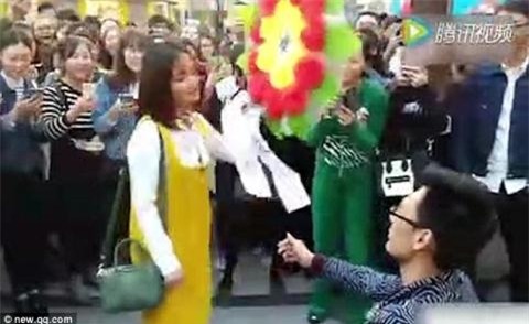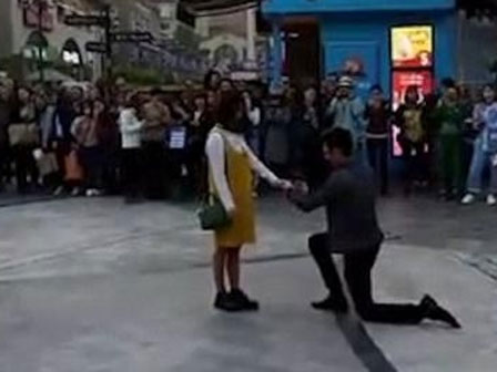 Cô gái nhìn chằm chằm chàng trai, không nói gì, chờ đợi anh thể hiện hết màn cầu hôn lãng xẹt này. Những người chứng kiến tỏ ra phấn khích, hô hào cổ vũ và quay video lại.