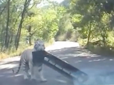 Trong đoạn video được đăng tải trên mạng xã hội mà nhiều người cho là diễn ra ở công viên hoang dã Bát Đạt Lĩnh, có thể thấy một con hổ khá lớn rất hung tợn đã lao thẳng vào đầu chiếc xe của du khách. Không chỉ gầm gào đe doạ khiến những người ngồi trong xe vừa phấn khích lại vừa lo lắng không biết phải làm sao, con hổ còn phá tung chiếc ba-đờ-sốc phía trước xe và ngậm nó trong miệng rồi biến mất giữa rừng sâu.
