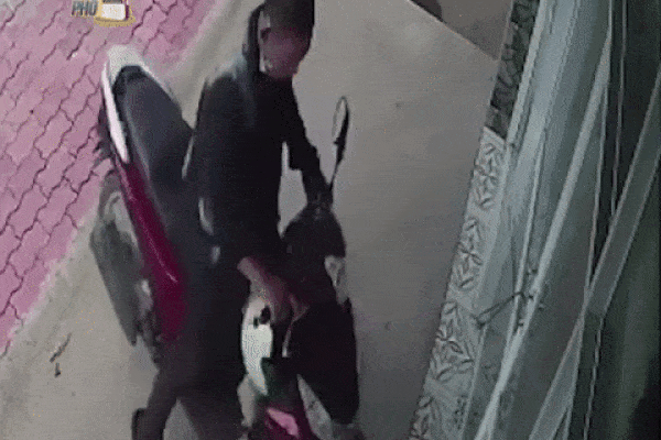 Thời điểm trên, xuất hiện một đối tượng mặc áo chống nắng, đeo khẩu trang, đi bộ tiến về phía chiếc xe SH màu trắng đang dựng trên vỉa hè rồi dùng chân bẻ khóa chiếc xe. Vài giây sau, hắn dắt chiếc xe ra phía ngoài rồi nhanh chóng tẩu thoát.
