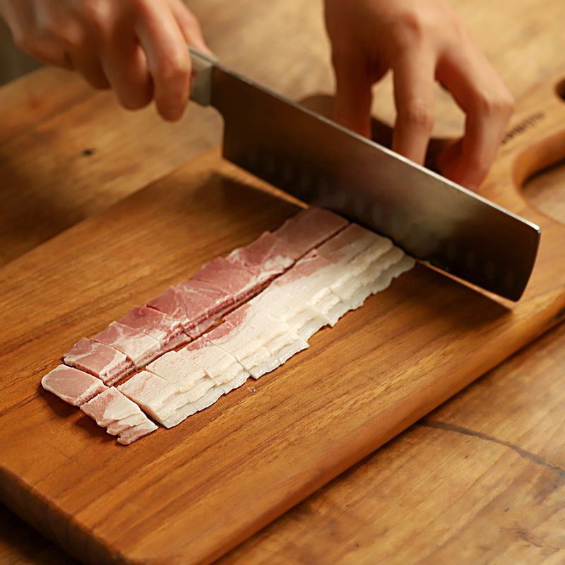 Bước 1: Bắp cải bạn mua về rửa dưới vòi nước, ngâm với nước muối pha loãng rồi sau đó lại rửa sạch dưới vòi nước. Đối với món ăn này bạn nên mua loại bắp cải ở cửa hàng bán thực phẩm sạch để đảm bảo độ an toàn, tươi ngon. Cắt bắp cải đã làm sạch thành 3 miếng theo kiểu bổ cau, giữ nguyên phần lõi. Để bắp cải vào rổ cho ráo nước. Cắt thịt xông khói thành miếng nhỏ.