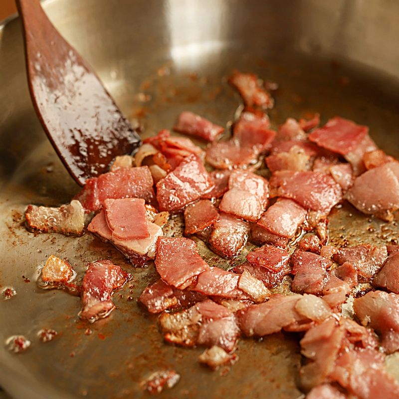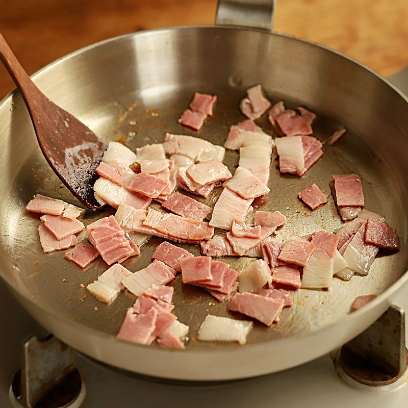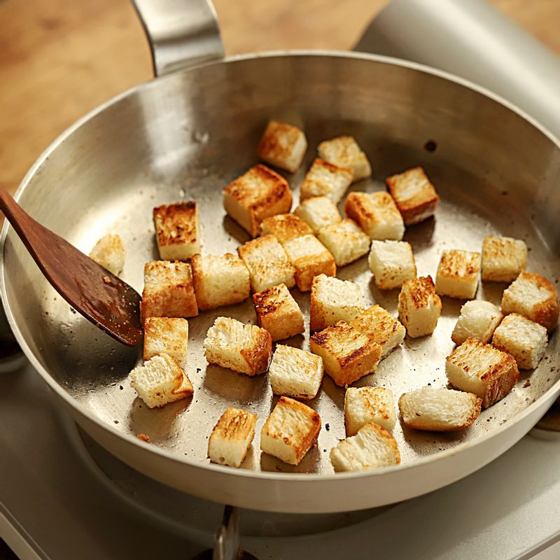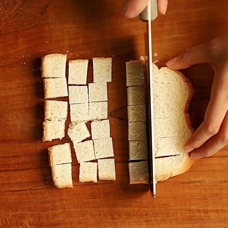 Bước 2: Cắt bánh mì thành từng miếng nhỏ cỡ ngón tay. Đặt chảo lên bếp, đun nóng. Sau đó cho bơ vào chảo rồi thả bánh mì vào nướng cho đến khi có màu vàng nâu. Trong một chảo khác, bạn cho thịt xông khói thái miếng nhỏ vào đảo cho ra bớt mỡ đến khi xém cạnh.