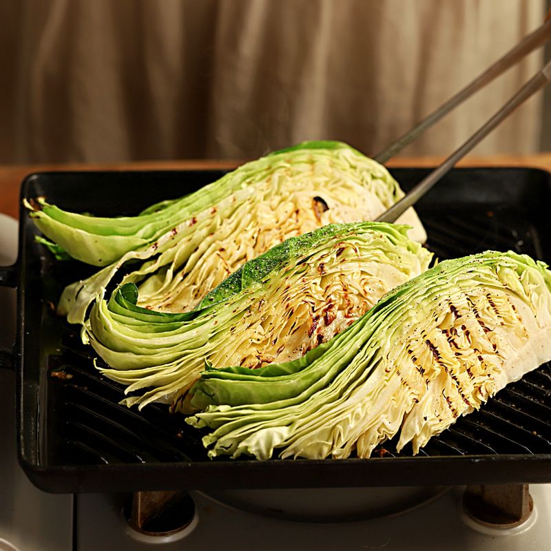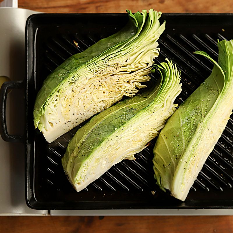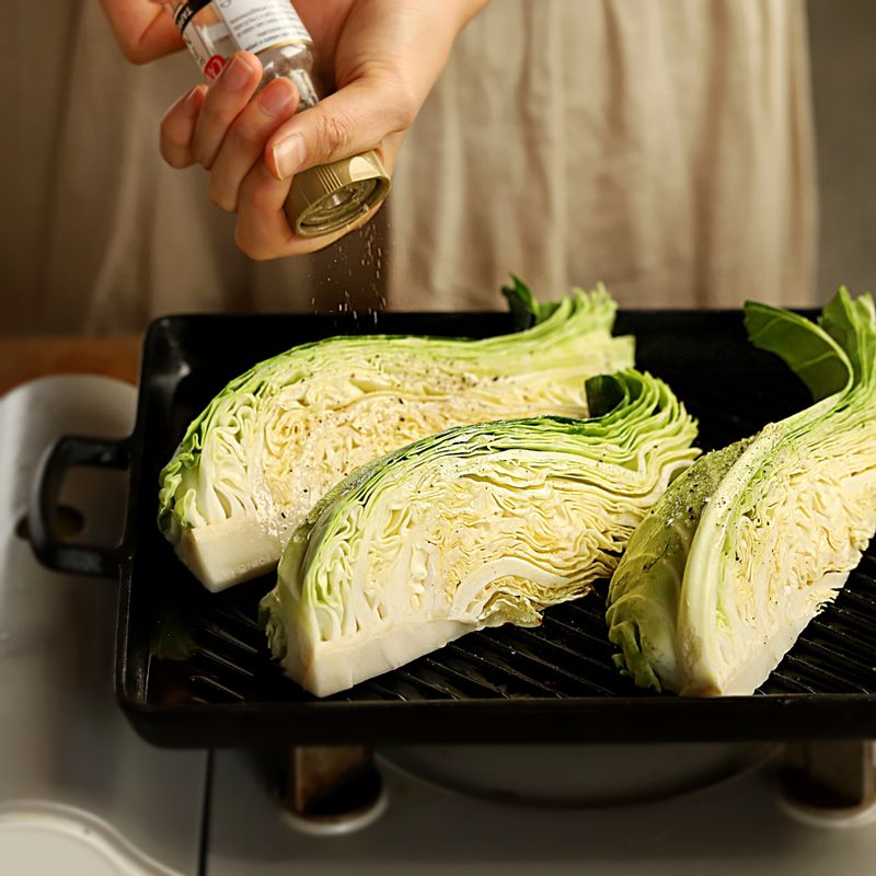 Bước 3: Cho bắp cải vào khay, rưới dầu ô liu, nêm chút muối và tiêu vào bắp cải rồi nướng cho đến khi vàng nâu cả hai mặt. Bạn có thể dùng chảo điện nướng thịt để thực hiện thao tác này. Hoặc nếu nhà không có chảo điện nướng thịt thì bạn có thể dùng chảo nướng trên bếp ga.