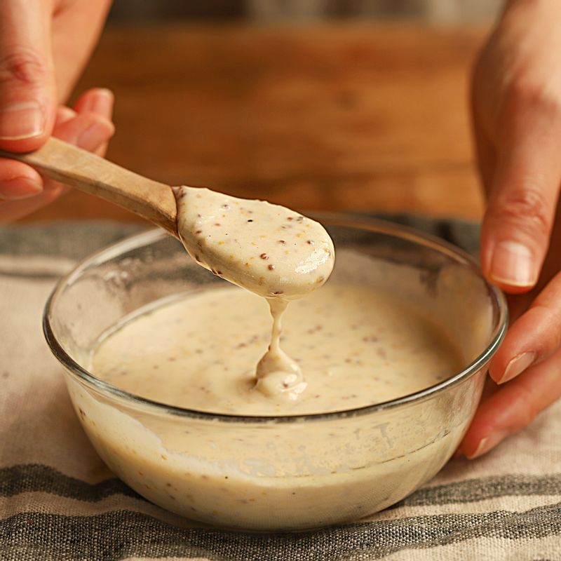 100g mayonnaise - ½ muỗng canh tỏi băm nhỏ - 1 muỗng canh mù tạt hạt (mù tạt nguyên hạt) - 1 muỗng canh nước cốt chanh - ½ muỗng canh nước mắm cá cơm - 2 muỗng canh phô mai parmesan - 4 muỗng canh dầu ô liu - Một chút muối - Một chút tiêu đen.
