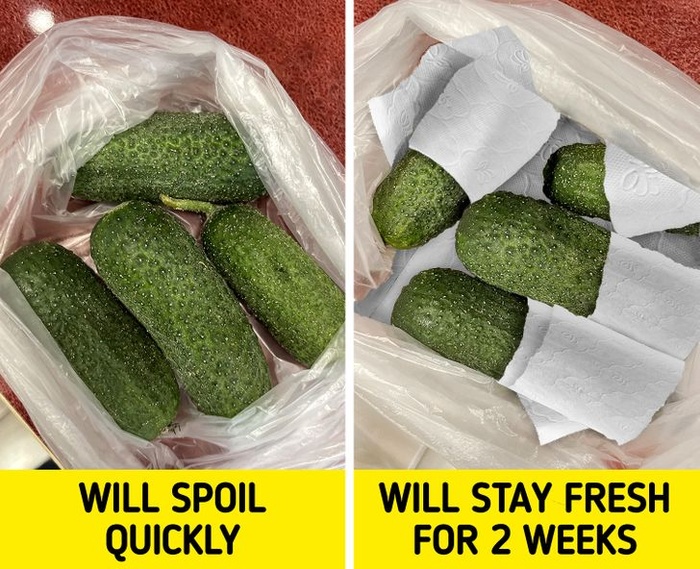 1. Gói từng quả dưa chuột trong khăn giấy và cho vào túi nilon có khóa zip sẽ giúp dưa chuột tươi lâu hơn.