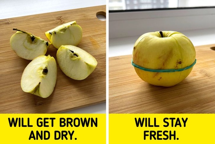 9. Nếu bạn đã thái lát một quả táo, hãy dùng dây chun buộc xung quanh quả táo để giữ chúng lại với nhau. Cách này sẽ giúp táo không chuyển sang màu nâu.