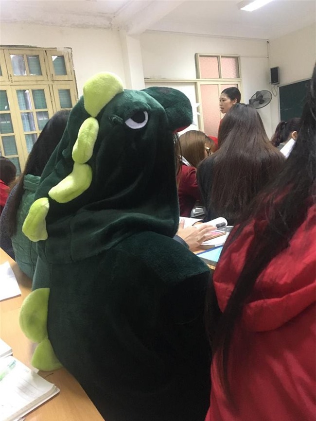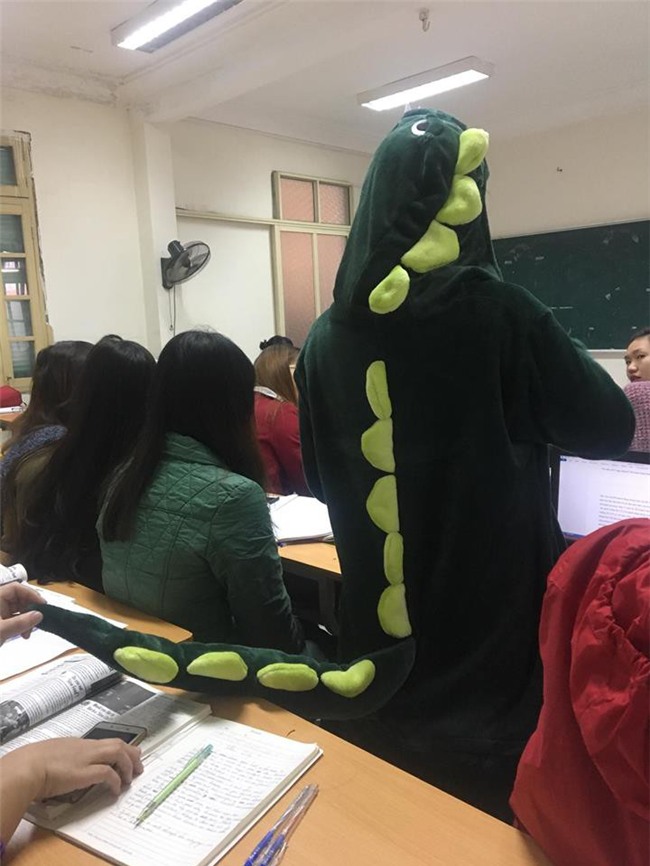 Thay vì mặc áo bông to đùng hay khoác chăn làm mất thẩm mỹ, cô bạn này đã hóa thân thành một con khủng long ngay giữa phòng học. Bộ quần áo khủng long liền thân chắc hẳn là ấm lắm, mặc dù giữa đám đông nhìn nó hơi có phần nổi bật khiến nhiều người phải ngoái nhìn.