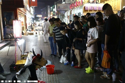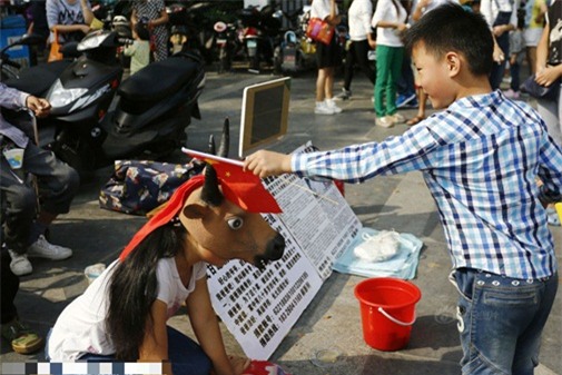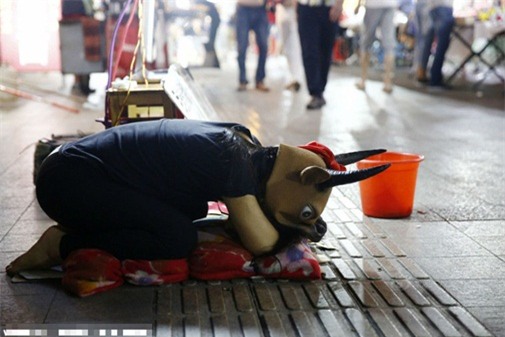Dù trời nắng hay mưa cô bé vẫn kiên trì quỳ gối giữa đường phố đeo chiếc "đầu trâu" lên và bên cạnh là một tấm biển “Tôi sẵn sàng làm trâu bò để mọi người trêu đùa, xin hãy cho tôi một ít tiền, 5 đồng/1 làn trêu đùa“.