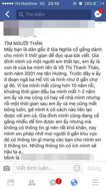 Sau đó nhỏ bạn thân nhắn tin hỏi: "Mày có anh trai không?". Bình thường em sống khép kín, không hay tâm sự với ai nhiều mà. Em trả lời có thì bạn bảo rằng có anh Thoại đăng tin tìm.