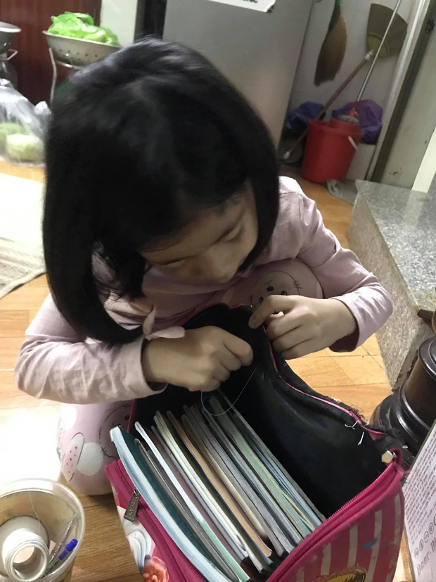 Người mẹ đăng tải hình cô con gái đang cặm cụi khâu lại cắp sách cùng dòng chia sẻ: "Nhà mình kinh tế cũng bình thường, không đến nỗi đói ăn đói mặc. Đôi khi mình hay than thở về tiền để 2 con gái mình biết được kiếm đống tiền vất vả ra sao.