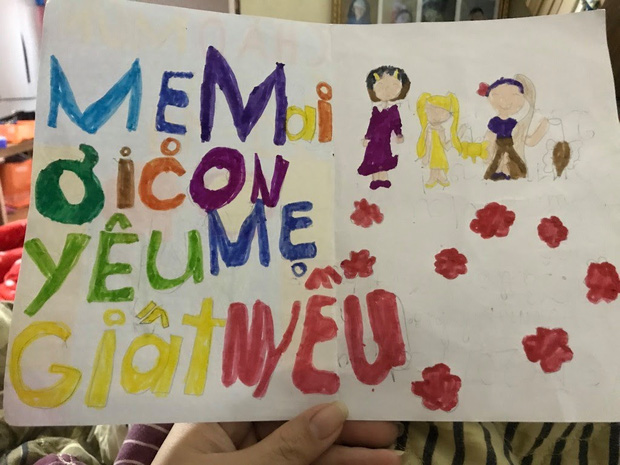 Trang My thích thể hiện tình yêu mẹ qua những lời yêu thương và tranh vẽ, dù có sai chính tả nhưng vẫn rất đáng yêu