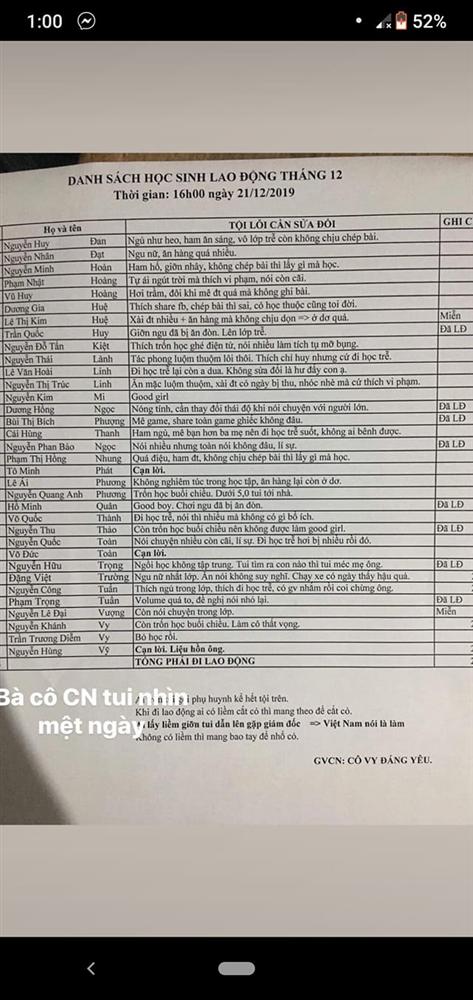 Mới đây, một cô giáo có tên Vy bất ngờ nổi như cồn trong group học đường vì đã nghiêm khắc phạt hội học sinh tinh quái. Cô in hẳn 1 danh sách dài tội lỗi của các em kèm theo hình phạt thích đáng.