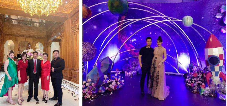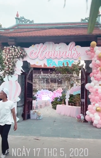 Đúng là rich kid sinh ra trong nhung lụa, con gái Thu Hương được ông bà bố mẹ tổ chức bữa tiệc đầu đời hoành tráng vô cùng. Sảnh đón tiếp khách mời tới dự tiệc to khổng lồ, trang trí theo phong cách hoàng gia, sắc hồng rợp kín cổng tòa lâu đài nơi gia đình Thu Hương đang sống. Lối vào bên trong cũng rực rỡ đèn hoa, xếp đầy bàn tiệc 2 bên. Tuy không có ảnh cận cảnh bàn tiệc nhưng ai cũng đoán chỉ toàn sơn hào hải vị, chẳng thua kém tiệc cưới cách đây hơn 1 năm của vợ chồng nàng tiểu thư siêu giàu.