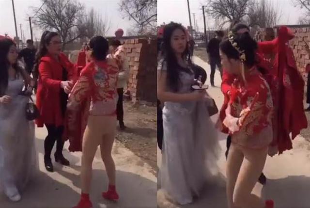 Theo những hình ảnh được chia sẻ trên mạng xã hội, một cô dâu đang mặc một chiếc váy cưới màu đỏ truyền thông thì bị đám khách nam tiến tới trêu chọc. Những người này đã cố tình kéo chiếc váy mà cô dâu đang mặc, khiến phần dưới của váy tuột hẳn khỏi người. Rất may bên trong, cô dâu còn mặc một chiếc quần tất da, nếu không cô đã gặp phải sự cố "lộ hàng" đáng xấu hổ.