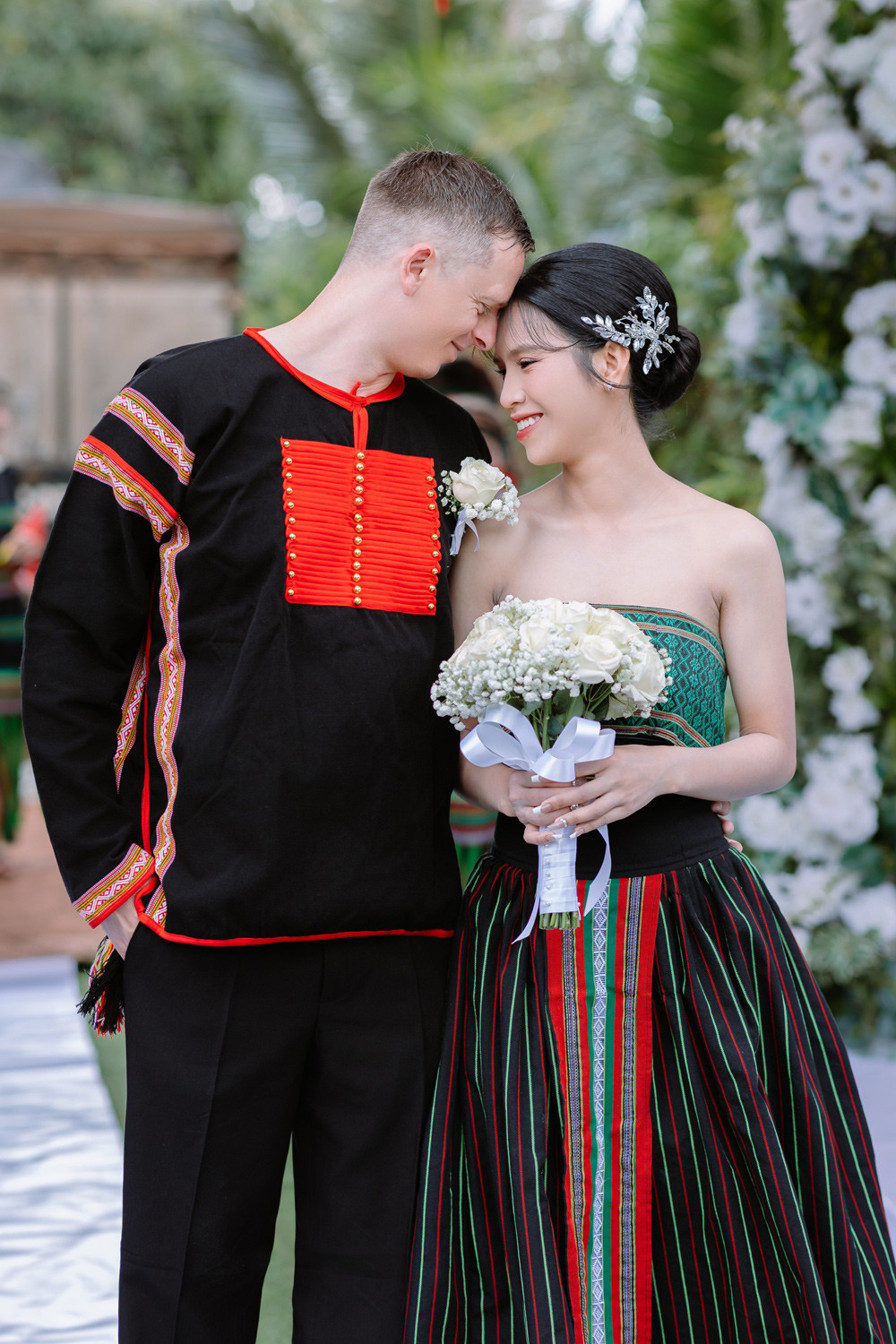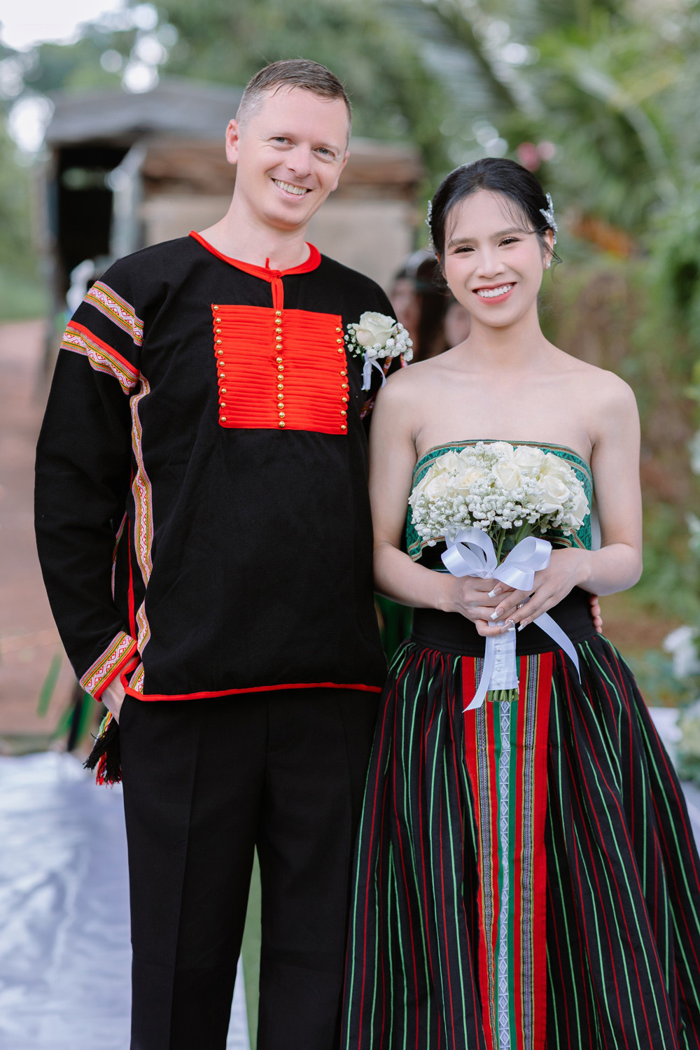 Trong video, cô dâu Ê Đê xinh đẹp sánh vai cùng người chồng ngoại quốc. Chú rể và bố mẹ diện trang phục truyền thống của người Ê Đê, hòa vào không khí rộn ràng của ngày vui.