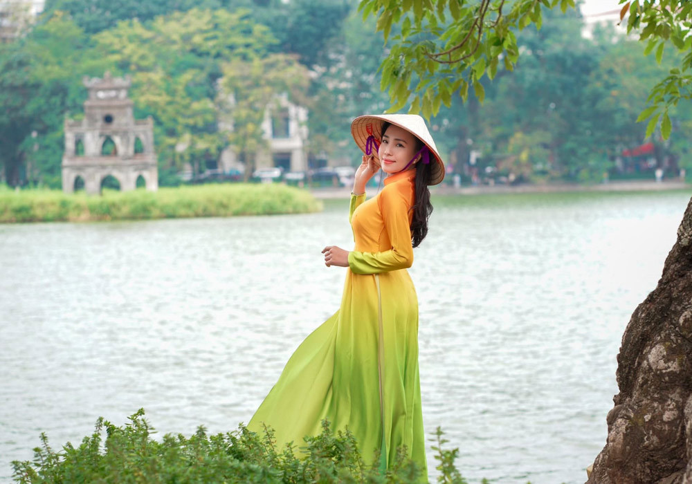 Trong bộ áo dài đỏ, người phụ nữ Kiên Giang nổi bật với khuôn mặt ưa nhìn, sống mũi cao, đường nét nhỏ nhắn. Vẻ đẹp dịu dàng, nền nã của chị được ví “không thua kém hoa hậu”.