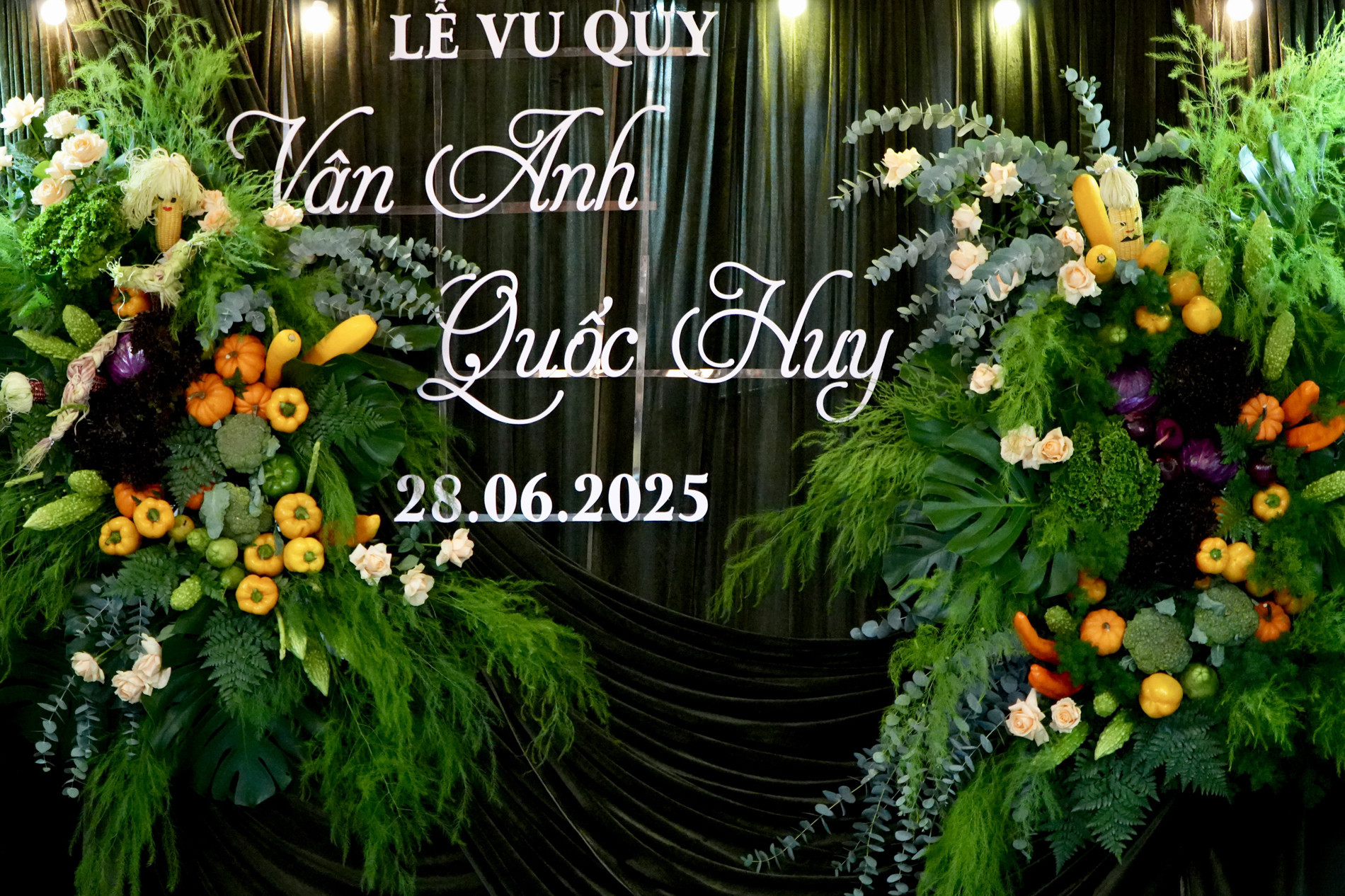 Từ cổng vào, bàn tiệc cho đến phông nền, góc chụp hình… đều được trang trí bằng hàng chục loại nông sản khác nhau, đính kết kỳ công với đủ màu sắc.