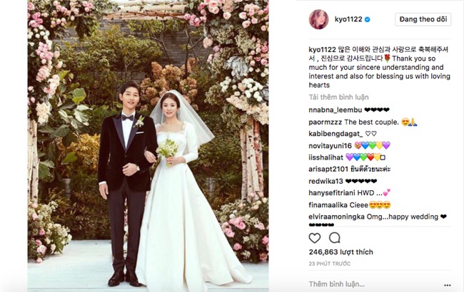 trạng thái cảm ơn kèm bức ảnh cưới của mình trên Instagram. Song Hye Kyo