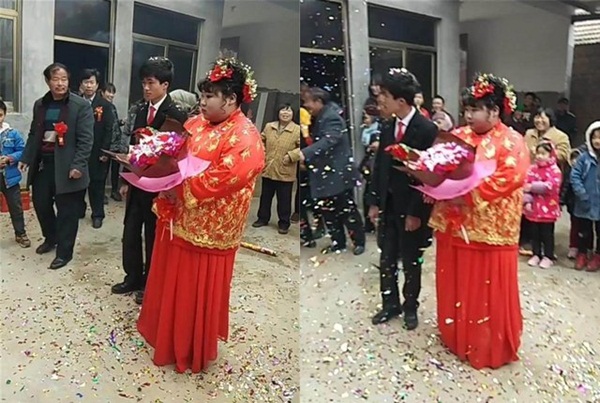 Giống như nhiều đám cưới tại Trung Quốc khác, sau khi thực hiện các nghi lễ xin dâu bên nhà gái, chú rể sẽ đón cô dâu về nhà mình để làm lễ kết hôn. Trong bức ảnh được một số người thân chụp lại, cô dâu và chú rể trẻ tuổi này đang đứng ngoài sân trong những tiếng pháo, tiếng vỗ tay chúc phúc của mọi người.