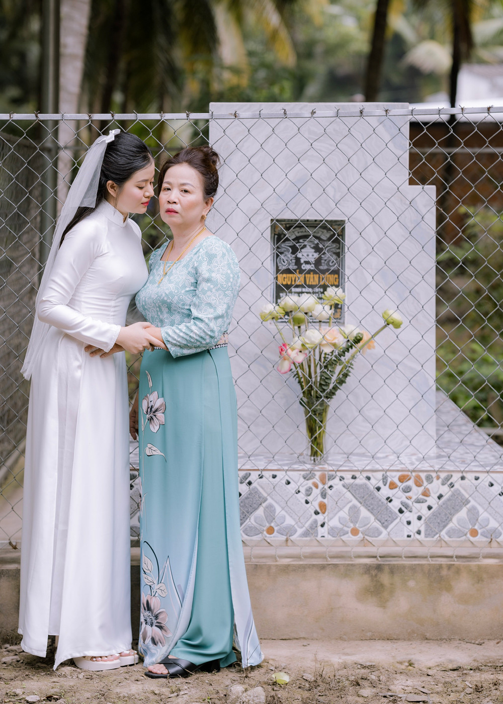 “Mộ cha ngay sát nhà tôi. Ngày cưới, tôi muốn chụp ảnh bên mộ cha một phần để lưu giữ kỷ niệm, một phần muốn có cha đồng hành dù trong hoàn cảnh nào”, cô kể.