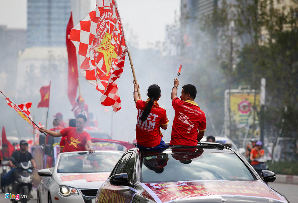 Đoàn cổ động viên sử dụng pháo khói ở trên đường. Tuy nhiên, hội cổ động viên quán triệt không sử dụng trong khuôn viên sân vận động quốc gia Mỹ Đình.