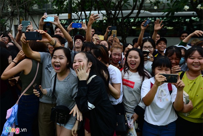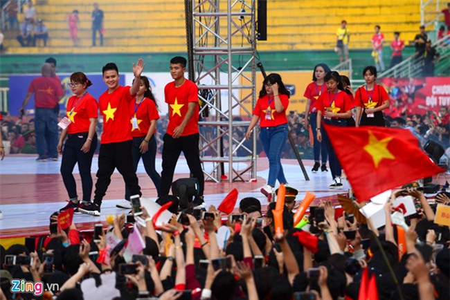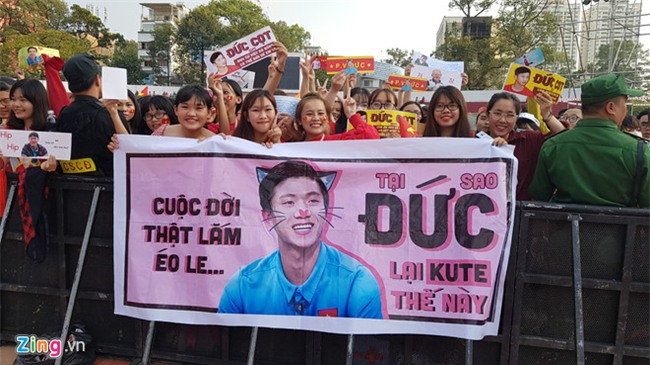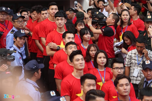 Khi đoàn xe đưa đội tuyển đến nơi, đám đông hàng trăm bạn trẻ ồ lên hô vang tên từng cầu thủ họ nhìn thấy.