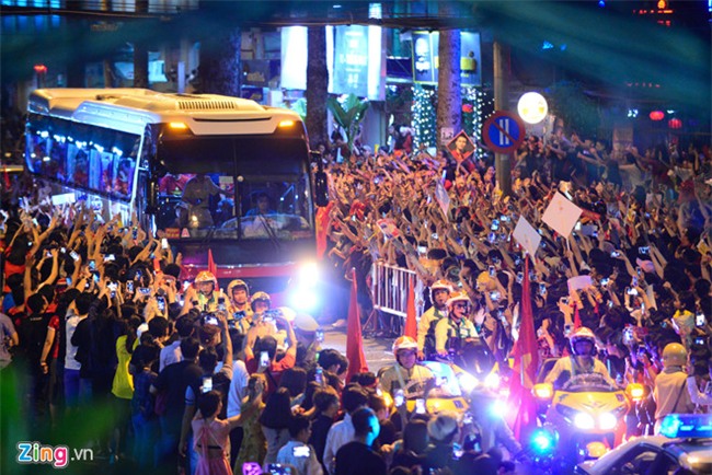 Kết thúc buổi lễ, chiếc xe bus chở các tuyển thủ U23 Việt Nam rời sân Thống Nhất với hàng dài người hâm mộ ở hai bên đường. Ảnh: Tùng Tin.