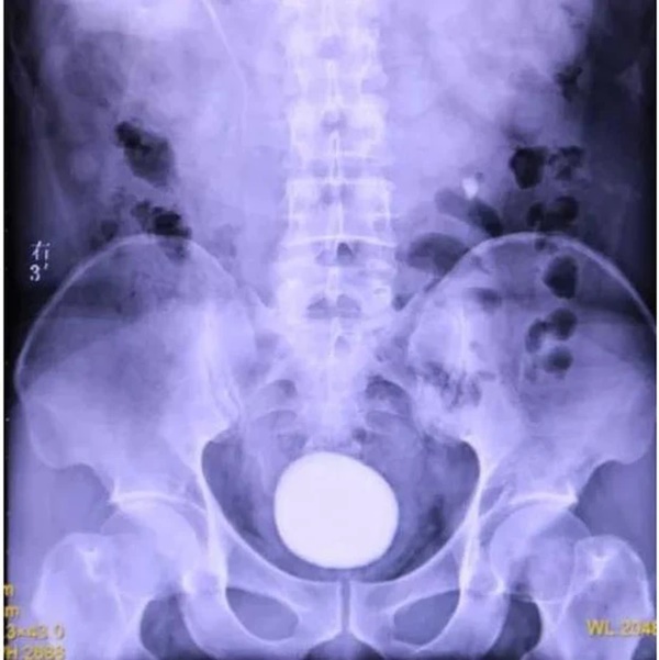 Hình tròn màu trắng chính là một viên sỏi có chu vi 6cm, to bằng nắm tay chiếm giữ gần một nửa thể thích bàng quang của một bệnh nhân sau thời gian dài giữ thói quen nhịn tiểu