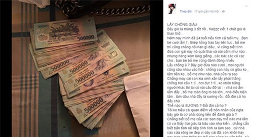 Mùng 3 Tết, một bài chia sẻ khá dài của cô gái có tên Y.H trên mạng xã hội với chủ đề "Lấy chồng giàu" đã gây bão với hơn 50 nghìn lượt thích và hàng ngàn tranh luận của cư dân mạng. Cô gái 24 tuổi chia sẻ: "Bây giờ đứa nào cưới, mọi người cũng xâu nhau vào hỏi: Chồng con này có giàu không, lắm tiền không , bố mẹ như nào, nhà cửa ra sao... Chẳng may cái con kia xinh xắn lấy phải thằng chồng hơi xấu 1 tí, hơi đụt 1 tí, không khôn bằng người khác thì lại có vài câu đỡ lại: nhà nó ấm lắm đấy, bố mẹ toàn ông to bà lớn, nhà điều kiện lắm, làm dâu nhà đấy là sướng rồi, đổi đời cả họ đấy chứ!"