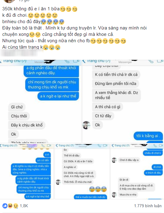 Tâm sự mới nhất của một chàng trai sau khi chia sẻ trên mạng xã hội đã ngay lập tức nhận được nhiều tranh luận. Chẳng là chàng trai muốn rủ bạn gái mình đi chơi, đi ăn, nhưng đến khi cô gái hỏi có bao nhiêu tiền, chàng trai thành thật bảo có 350 nghìn thì ngay lập tức nhận được sự dè bỉu từ người yêu.