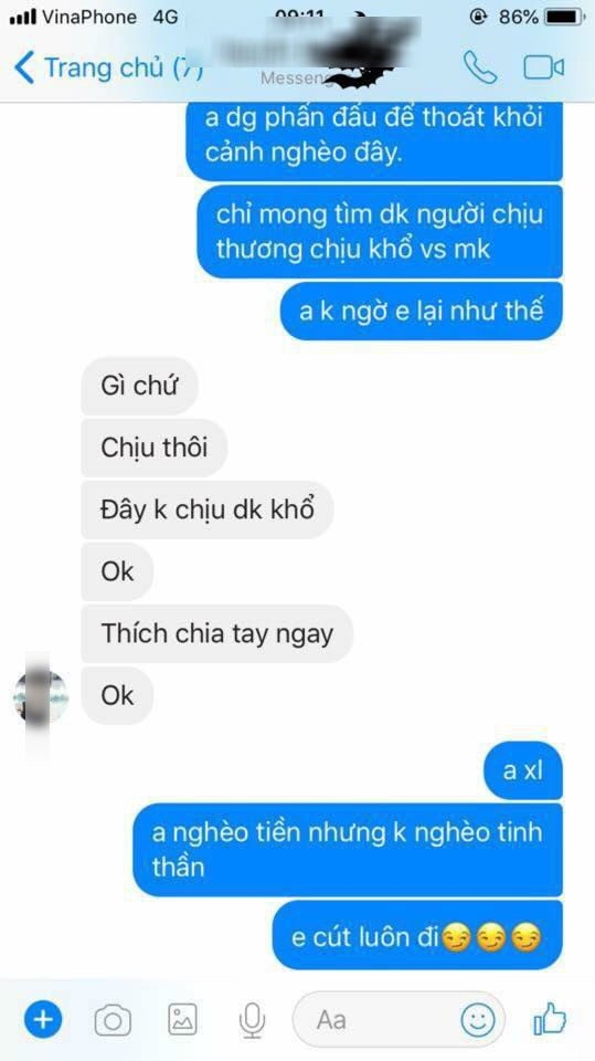 Không những thế, trước đó cô gái này còn ''nói khéo'' bạn trai mua cho mình một sợi dây chuyền mà ''Em thấy chúng nó đeo đẹp lắm''. Mặc dù chàng trai đã nói hoàn cảnh hiện tại của mình chưa dư dả, nhưng thay vì nhận được sự cảm thông của người yêu, chàng trai bị cô gái chia tay và ''đuổi khéo'' ngay lập tức.
