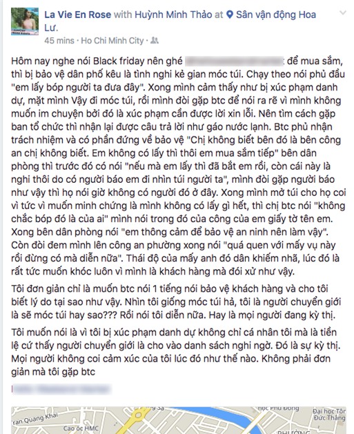 Ngày 25/11, Tây Hà (SN 1993, tên thật là Đỗ Minh Tiến) đã chia sẻ câu chuyện mà mình gặp phải khi mua sắm trong ngày Black Friday ở Sân vận động Hoa Lư TP. HCM. Tây Hà là cô gái chuyển giới khá nổi tiếng trong cộng đồng LGBT, hiện đang là trợ lý cho các dự án về người chuyển giới của tổ chức bảo vệ và thúc đẩy quyền của người đồng tính, song tính và chuyển giới (ICS).