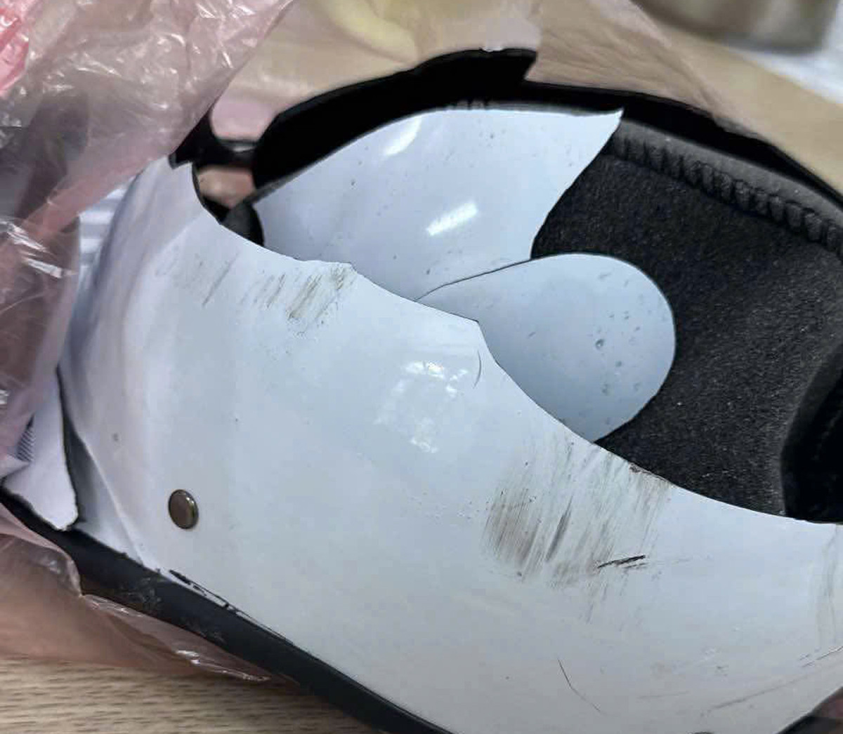 Nhóm đối tượng không chỉ dùng tay chân mà còn sử dụng mũ bảo hiểm đập mạnh vào đầu và người nạn nhân, khiến chiếc mũ vỡ vụn. Điện thoại của cô gái cũng bị hư hỏng nặng.