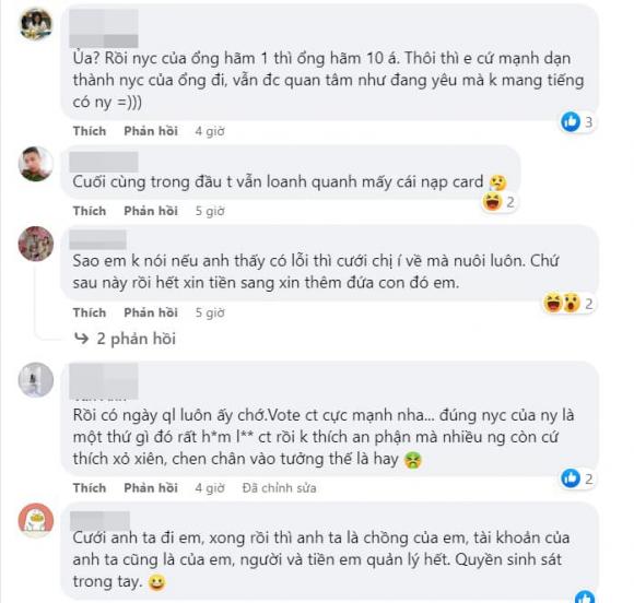 Dưới bình luận, cư dân mạng viết: "Dễ ẹc. Nhanh trí cho anh ấy thành người yêu cũ xong rồi làm như chị ấy luôn. Được cả đôi. Vừa không cần yêu vừa được quà. Thế là lời rồi nhá", "Thế em hỏi thằng người yêu xem hỏi đấy là xin tiền chứ lỡ người yêu cũ của anh muốn lên giường với anh anh vẫn chấp nhận ạ", "Nhanh trí trở thành người yêu cũ để anh ấy bù đắp ạ"...