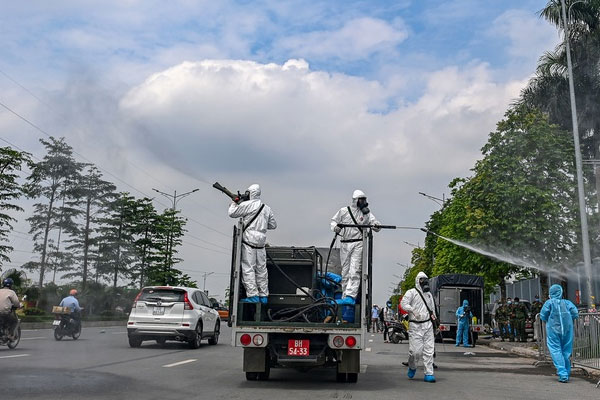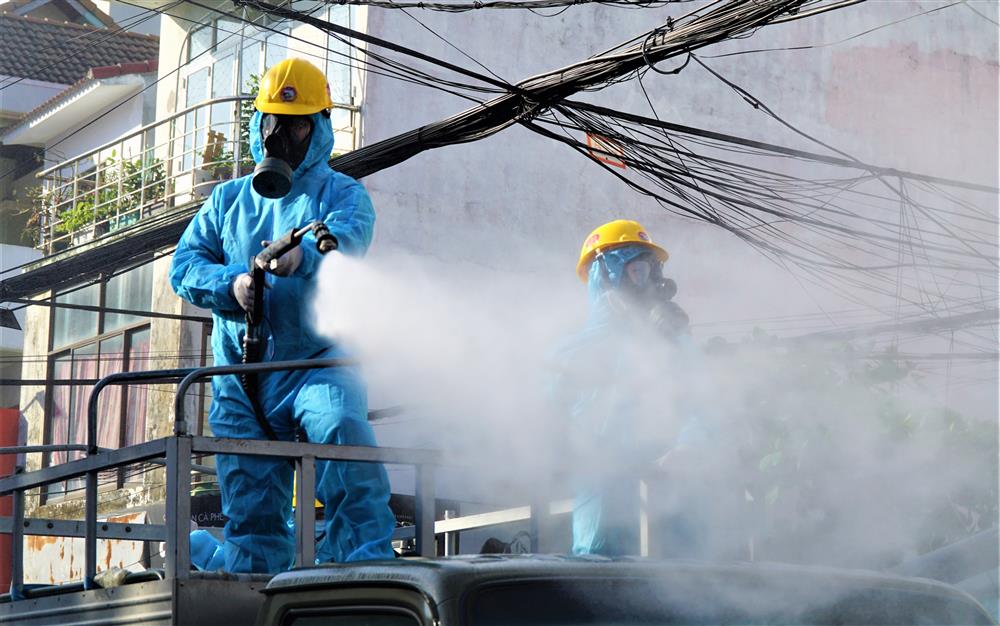 Lực lượng chức năng phun thuốc khử khuẩn tại những khu vực các ca mắc Covid-19 đến
