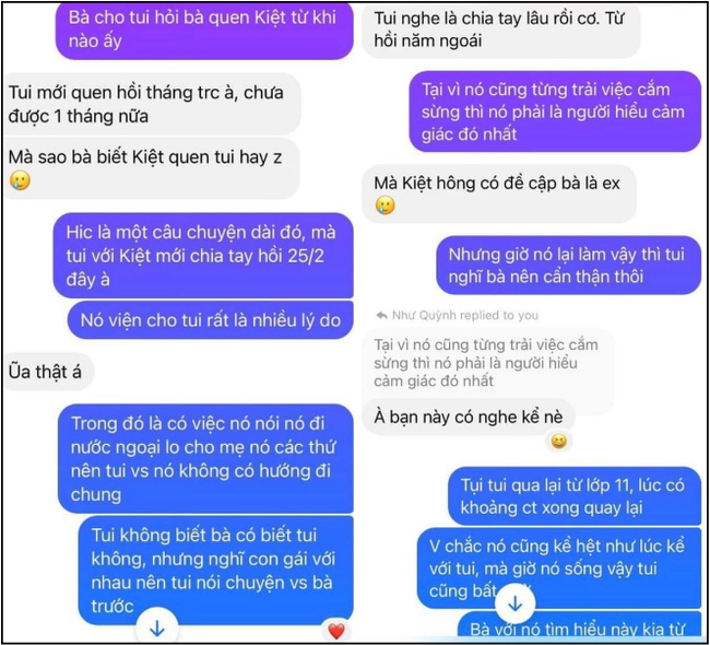 Đi kèm với câu chuyện chính là những đoạn tin nhắn của cô gái dành cho bạn gái sau của người yêu. Cô gái này đã chia sẻ rằng K. nói với mình chia tay người yêu từ năm ngoái nên cả hai mới tiến đến yêu đương.