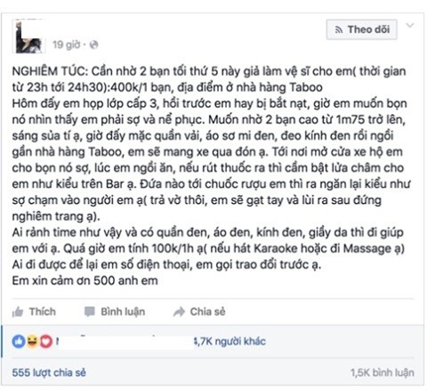 Theo đó, cô gái cho biết, khi dự tiệc, cô cần có hai vệ sĩ đi cùng. Thời gian làm việc từ 23h đến 2h sáng, với mức lương 400.000 đồng/người.