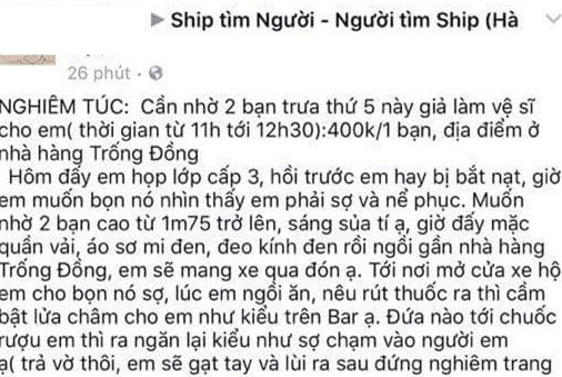 Mới đây, bài đăng muốn tuyển hai vệ sĩ nam để ra oai với bạn bè trong buổi họp lớp cuối năm của một cô gái ở Hà Nội nhanh chóng trở thành tâm điểm chú ý trên mạng. Không cần biết thông tin này là thật hay giả, nhiều chàng trai vẫn hào hứng vào đăng ký xin ứng tuyển.