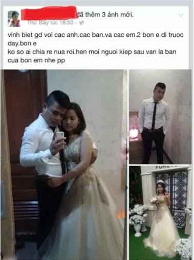 Đôi nam nữ mặc áo cưới chụp ảnh trước khi uống thuốc cỏ tự tử được đăng tải gây xôn xao cộng đồng mạng. |