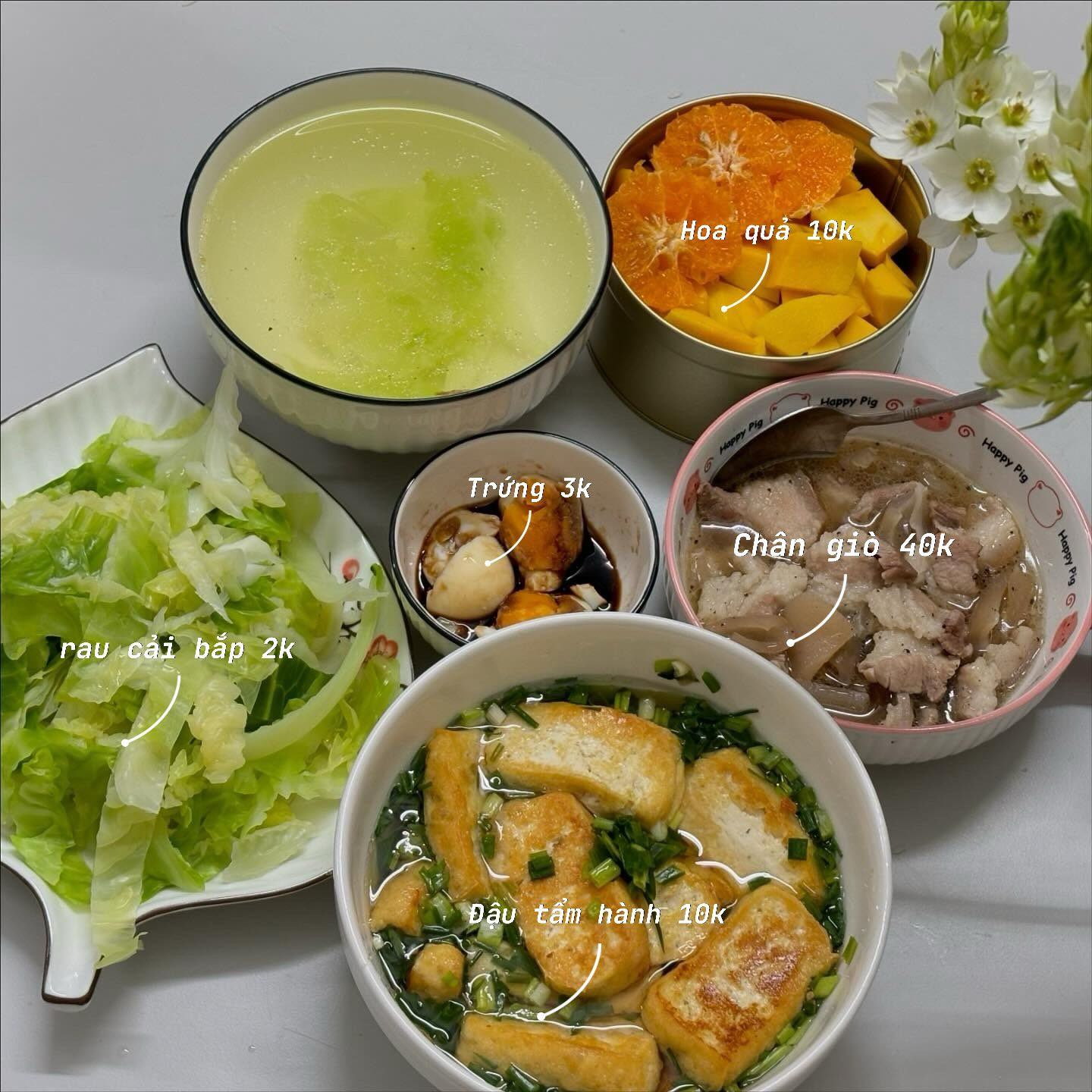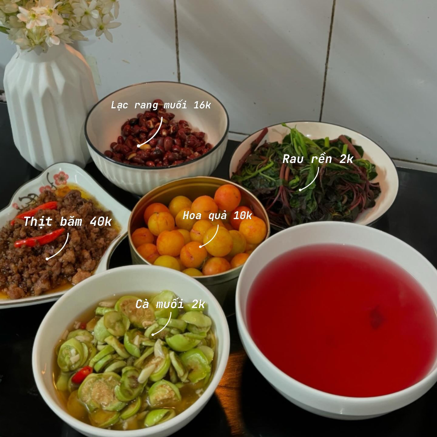 Mâm cơm của cô gái này thường gồm một món chính (thịt, cá) khoảng 50.000 đồng, rau luộc, nước canh rau luộc, đồ muối ăn kèm, đậu/lạc, hoa quả tráng miệng.