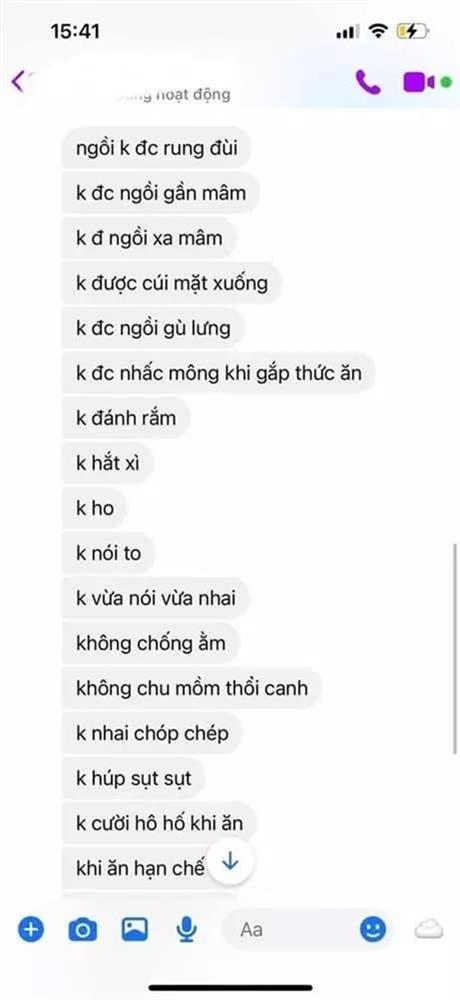 Cụ thể những quy tắc mà chàng trai nói với bạn gái như sau: 'Không và quá 3 lần đưa bát lên miệng, không gắp thức ăn đưa trực tiếp vào miệng, không dùng đũa khuấy vào tô canh, không xới lộn thức ăn trong đĩa, không nhúng đầu đũa vô bát chấm, không cắn răng vào đũa, không liếm đũa thìa, không gõ đũa vào bát, không dùng đũa chỉ linh tinh, ngồi không được rung đùi, không được ngồi gần mâm, không được ngồi xa mâm, không được cúi mặt xuống, không được ngồi gù lưng....'.