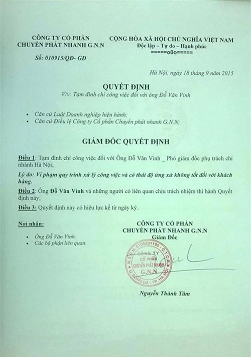 vụ chuyển phát nhanh của công ty G.N.N. Ảnh: NVCC. |