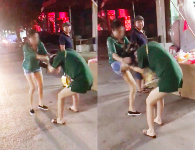 Theo đó, sau khi túm tóc lôi cô gái váy xanh ra đường, người phụ nữ liên tục chửi bới bằng lời lẽ khiếm nhã, đồng thời dùng chân đá liên tiếp vào bụng và bên hông của cô gái. Dù bị đánh khá đau, nhưng cô gái chỉ biết lí nhí xin lỗi mà không hề phản kháng lại.