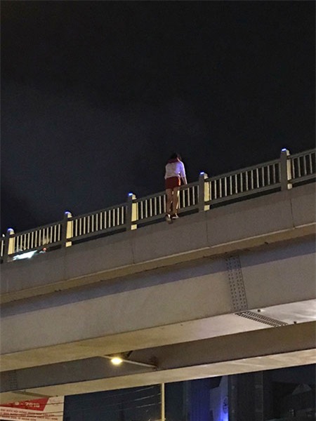 Cô gái đứng lơ lửng trên thành cầu - (Ảnh: Facebook) |