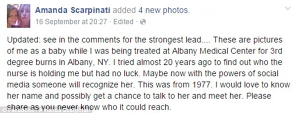 Amanda Scarpinati, 38 tuổi, ở NewYork, Mỹ đã bị bỏng nặng ở đầu và các ngón tay ngay khi mới 3 tháng tuổi và được chuyển vào bệnh viện. Tại đây, các bác sĩ đã tận tình chăm sóc cô, trong đó có một nữ y tá tốt bụng. Tuy nhiên, lúc ấy vì nhỏ quá nên cô cũng không biết và nhớ gì cả.